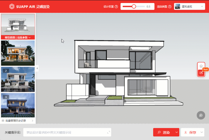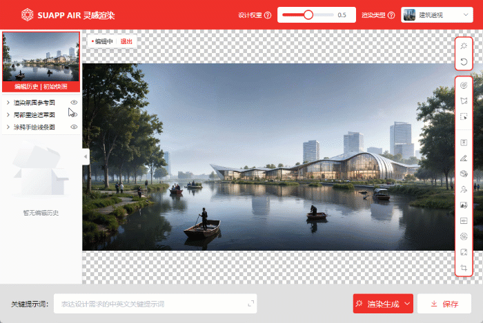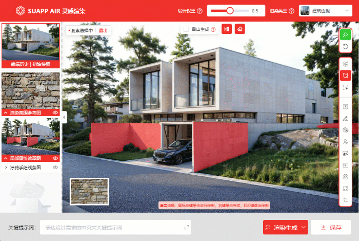 靈犀風格可以在渲染類型里找到 靈犀風格對關鍵詞識別更加精準 靈犀風格編輯 氛圍遷移 更新視頻: https://www.bilibili.com/video/BV11b421E7WV 一、靈犀風格編輯功能全新上線 使用位置:渲染類型里選擇“靈犀風格”時,編輯模式內的功能都可以使用。相對于其他風格,可操作更精準的局部重繪、更具靈感效果的氛圍參考圖、更合理的擴圖。 公眾號后臺回復“試圖” 即可入群體驗SUAPP靈感渲染 1、靈犀風格的局部重繪 想要局部修改調整圖面,使用重繪的選擇工具布置遮罩+關鍵詞,即可快速、精準反饋生成結果,關鍵詞的識別更加合理。 畫筆選擇+關鍵詞:藍色床單 套索選擇+關鍵詞:深色墻 對象選擇+關鍵詞:白色地磚 想要“無中生有”也更加簡便,在畫面增加或直接生成物體有兩種方式。 圖片拼貼+畫筆選擇 畫筆選擇+自由生成+關鍵詞:紅色單人沙發 自由生成:根據提示詞讓AI在涂抹的選區內自由發揮。只要在局部重繪時勾選自由生成,結合關鍵詞就可以更快速地“無中生有”。 在草地里自由生成小路 在庭院自由生成一棵紅楓 2、靈犀風格的氛圍參考圖 使用位置:左側“渲染氛圍參考圖”,結合靈犀風格,可以生成更加細致的效果。設計前期,結合氛圍參考圖給給方案草稿找意向。 設計中期,氛圍參考圖+局部重繪,當參考圖是一張材質圖時,可以更精準調整方案。局部重繪遮罩選擇好道路,插入瀝青道路的材質圖片,爛路根據材質參考圖變成好路。 同理,用材質參考圖修改墻體材質。 3、靈犀風格的擴圖 使用位置:編輯模式>擴圖填充,自動根據當前圖片自動擴圖,無需專門選擇某種風格。 公眾號后臺回復“試圖” 即可入群體驗SUAPP靈感渲染 二、新增氛圍遷移功能 使用位置:編輯模式>渲染氛圍參考圖>氛圍遷移,無需選擇任何風格。保證畫面內容不變,只遷移參考氛圍色調。推薦用于制作好的效果圖更換光影、色調。 1、使用步驟不同